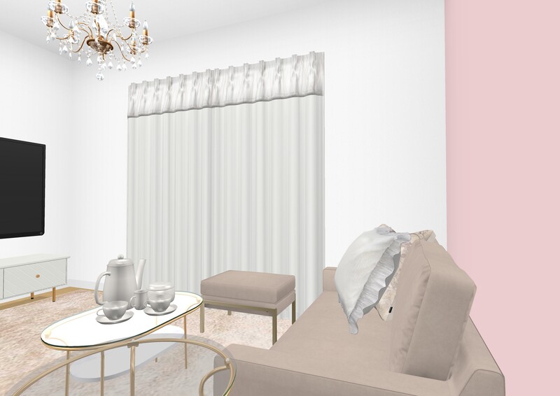 シャンデリアやフリル付きのカーテンを取り入れて女性らしい華やかな印象をプラス。