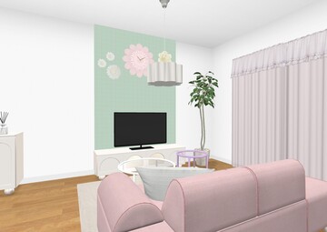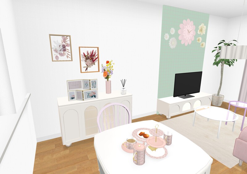 視線が集まりやすいTVボード後ろをデコレーションしてかわいさUP。