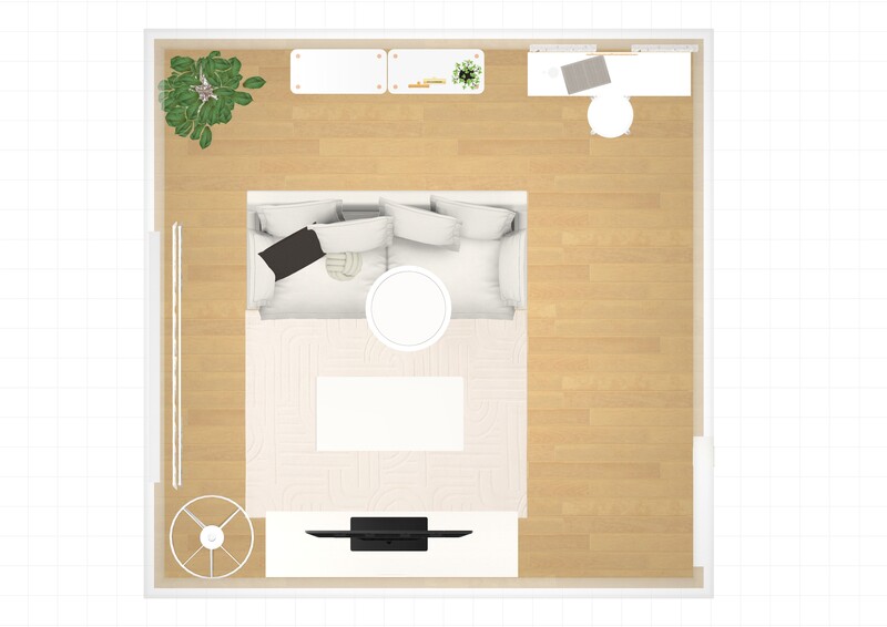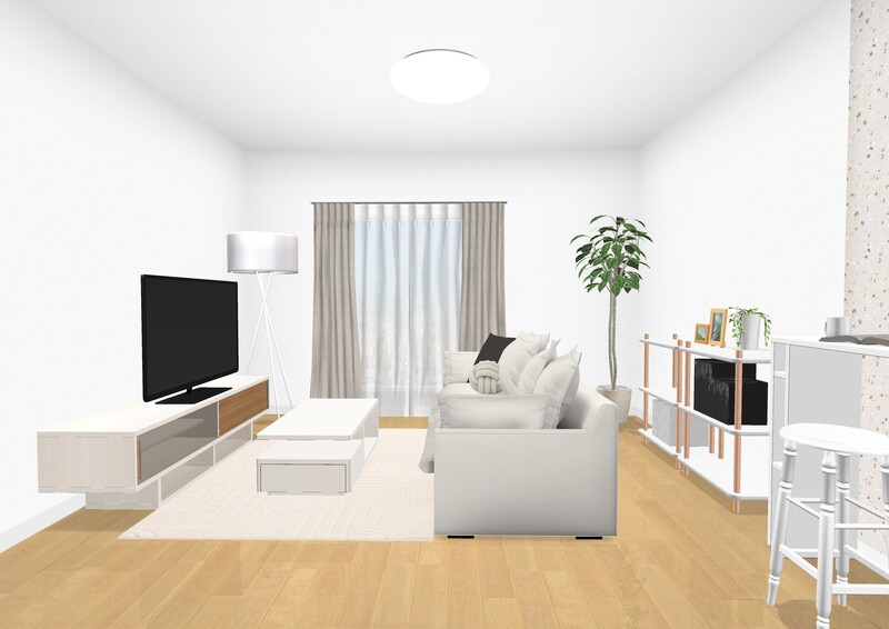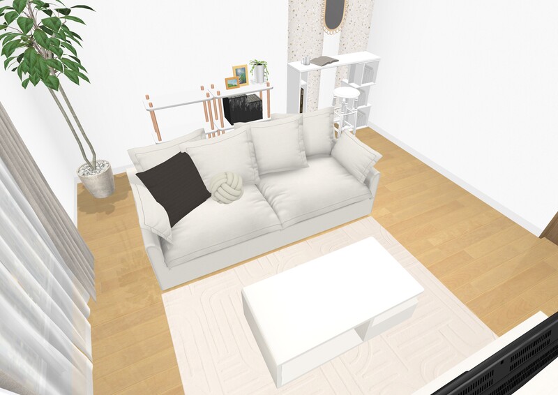 明るい色のラグマットでソファと床の境界線を出すことでそれぞれの存在感を際立たせ、おしゃれに演出