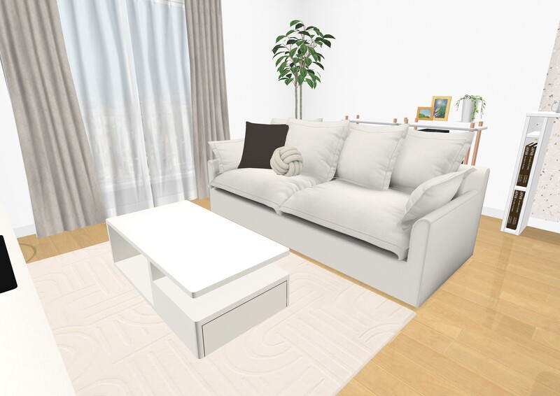 テーブルのカラーをラグと同色にすることで圧迫感が軽減されすっきりとした印象に