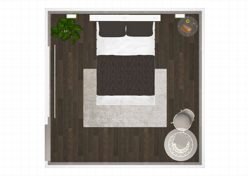 ベッドの足元にラグを敷くことで一気にホテルライクな印象に。立ち上がる時のクッションにもなり実用的にも◎